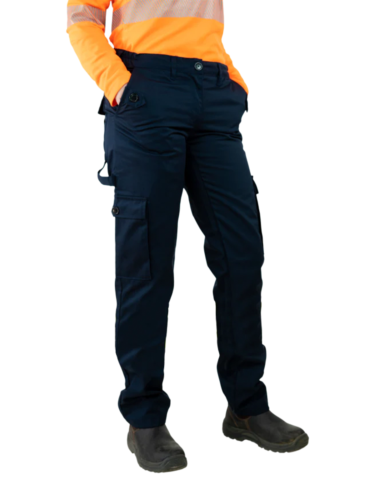 Designed with all the core features of button front closure, brass zipper fly, slash front pockets, cargo style pockets on leg, hammer loop, reflective tape, and partially elasticized waist