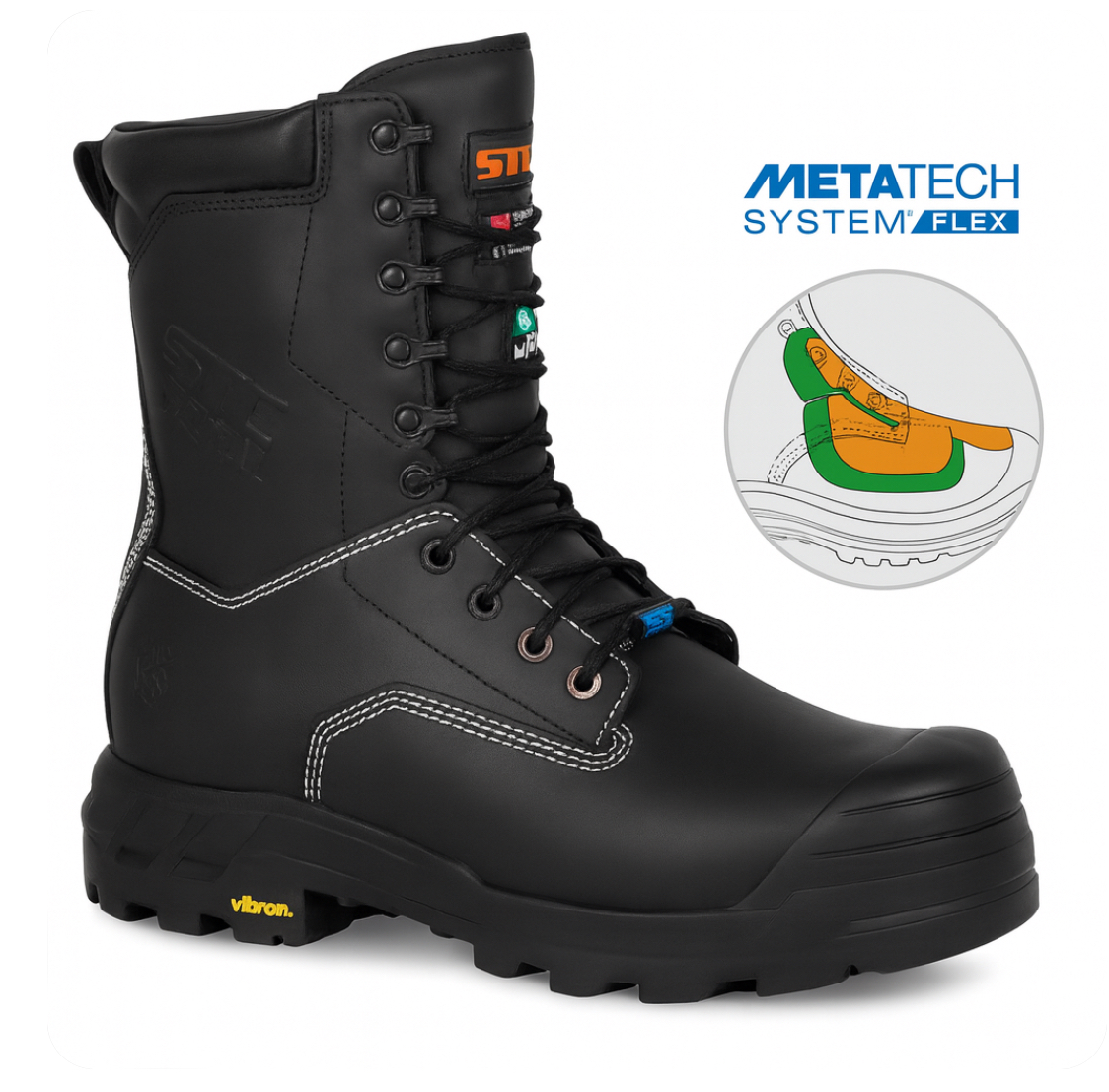 - METATECH System Flex Flexible metguard protection, CSA M certified, protects the top as well as the sides of the foot Lightweight, non-conductive composite toe with puncture-resistant plate.